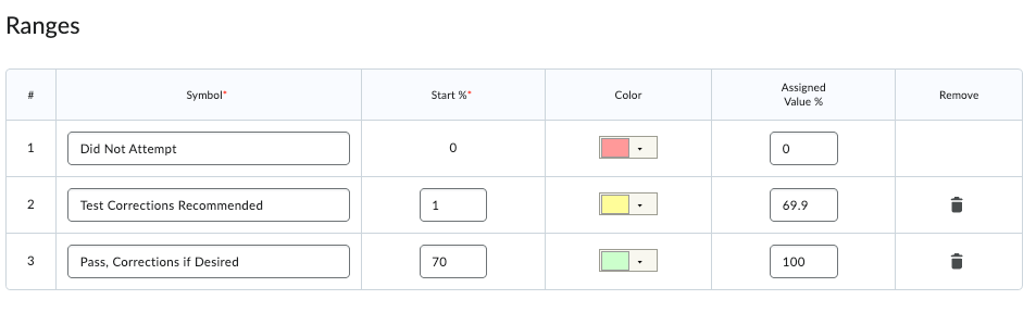 For content checks, they see one of three possible grades, along with the corresponding grade percentage earned: Did Not Attempt (in red), Corrections Recommended (in yellow), or Pass-Corrections if Desired (in green). For this one to work correctly, I set the percentages to reflect the 70% threshold I have for satisfying C-level requirements. You can see that in the image below.