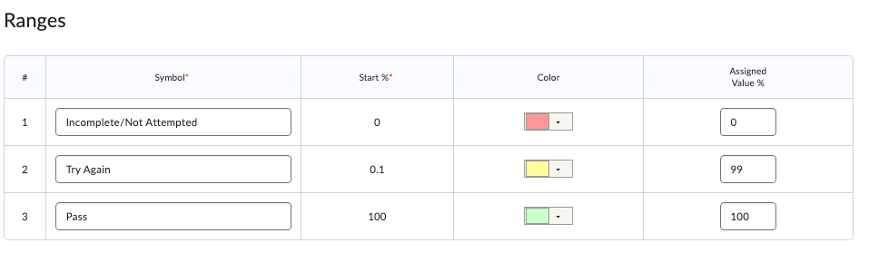 When setting up the gradebook, the system uses a default grading scheme of percentages to define the different levels of student achievement. The instructor can change the default scheme to one that D2L defines, or they can create new ones. In my initial iterations of specifications grading, I tried to keep it consistent and predictable and used the default grading scheme; students would see a numeric score for every activity and a corresponding percentage. However, even when I told them that a passing equals 1, they still thought an .82 was passing because they were associating it with a regular grade percentage. Aside from confusing students, I became frustrated because I was having to communicate with each student several times to remind them to revise their work. I even tried to include text-based gradebook entries to explain, but it actually “broke” the gradebook, with too much data to display.